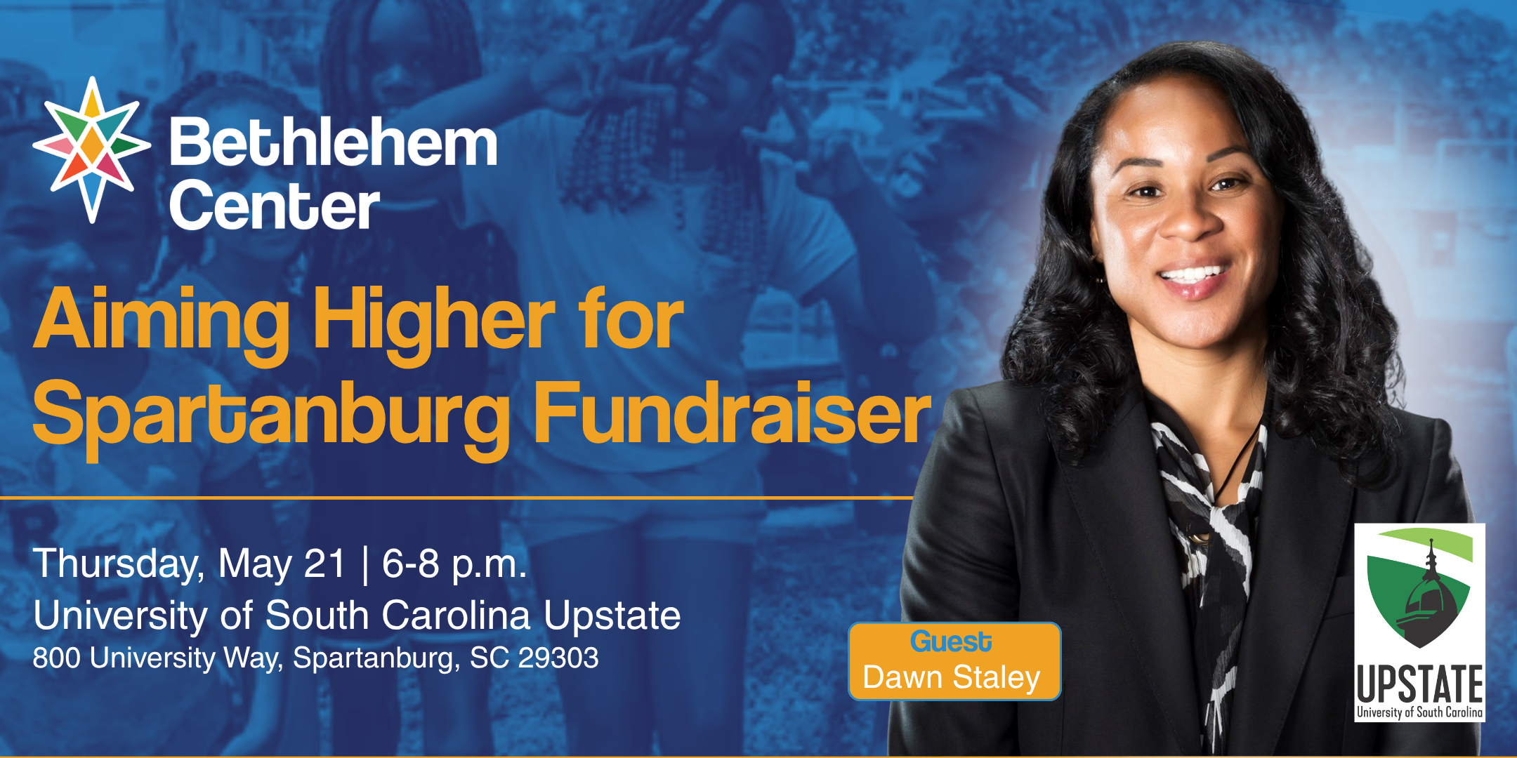 Be part of something historic. Bethlehem Center is hosting the Aiming Higher for Spartanburg Annual Fundraiser, featuring a special fireside chat with the renowned University of South Carolina Women’s Basketball Coach, Dawn Staley, on the vital role of community centers and the importance of investing in the people around us.